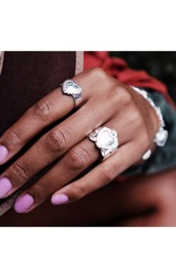 Vous aussi, adoptez le look rétro années 70 cet hiver! Vous allez adorer cette bague argentée et sa taille imposante. Le cabochon martelé, ouvragé à la main en forme de fleur est orné en son centre de quatre petites pièces ovales dans les tons noir décorées elle-mêmes de pierres effet turquoise. D’inspiration Navajo amérindienne, cette pièce d’exception pourra être portée en toute occasion.