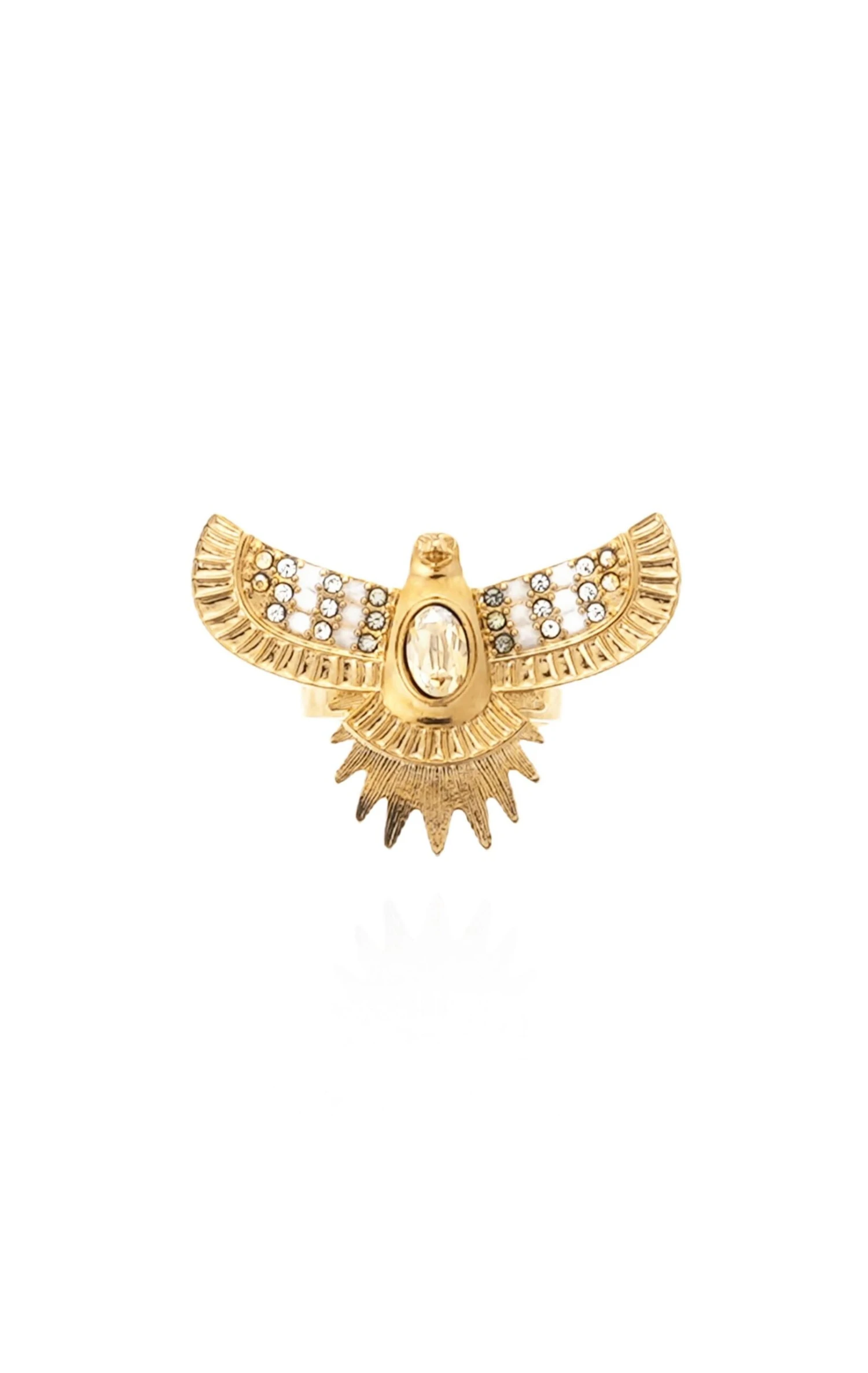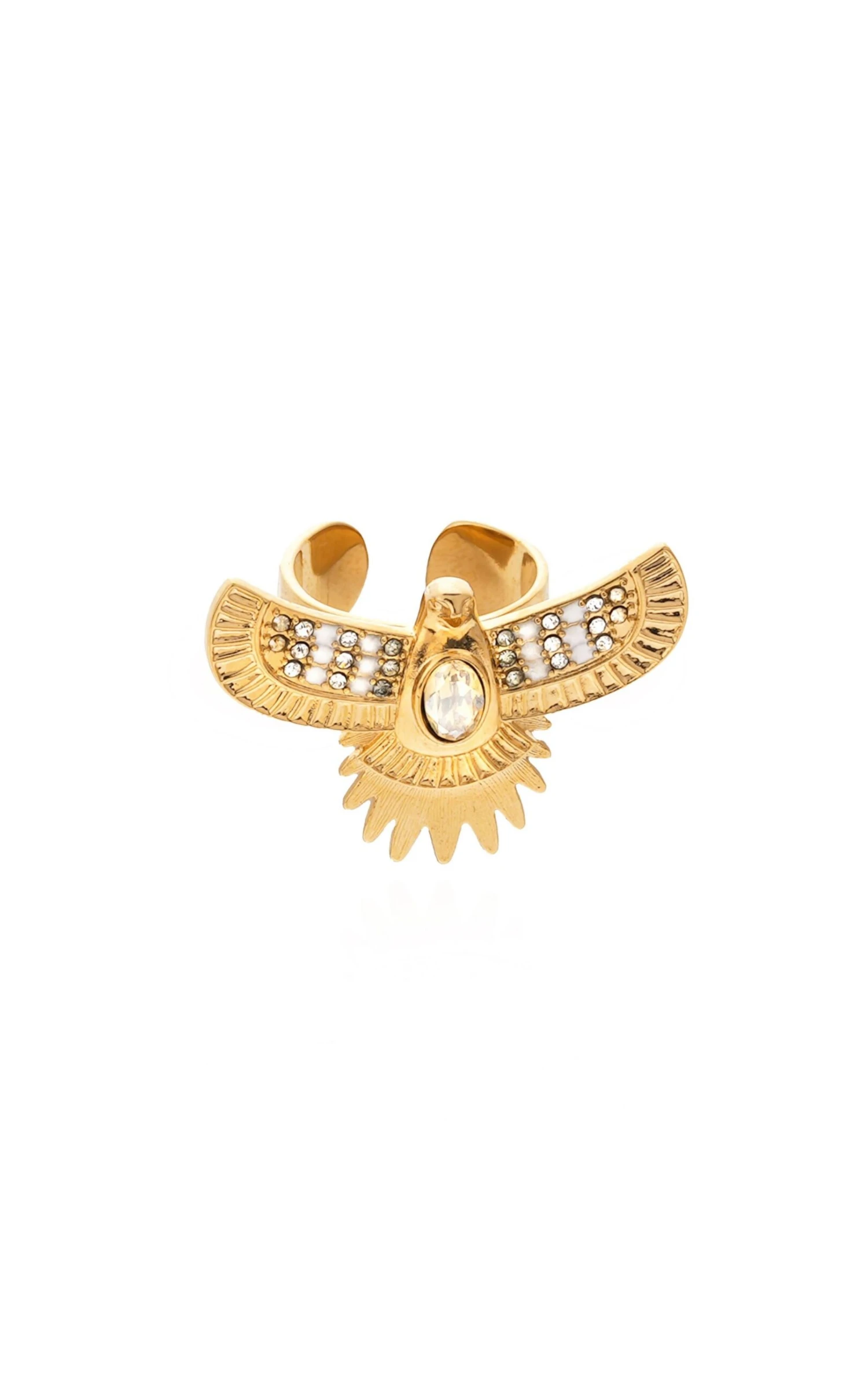 Illustrant à merveille le thème Brazil, emblématique d’HIPANEMA pour son éclat joyeux de couleurs et son exubérance solaire, la bague Curiba, dorée à l’or fin, exhibe sur son corps de bague martelé, un oiseau majestueux aux ailes striées, incrustées de strass et orné d’un cabochon facetté au centre. Ajustable car ouverte au dos, elle convient à toutes les tailles et habillera ainsi vos mains d’une élégance colorée et iconique!