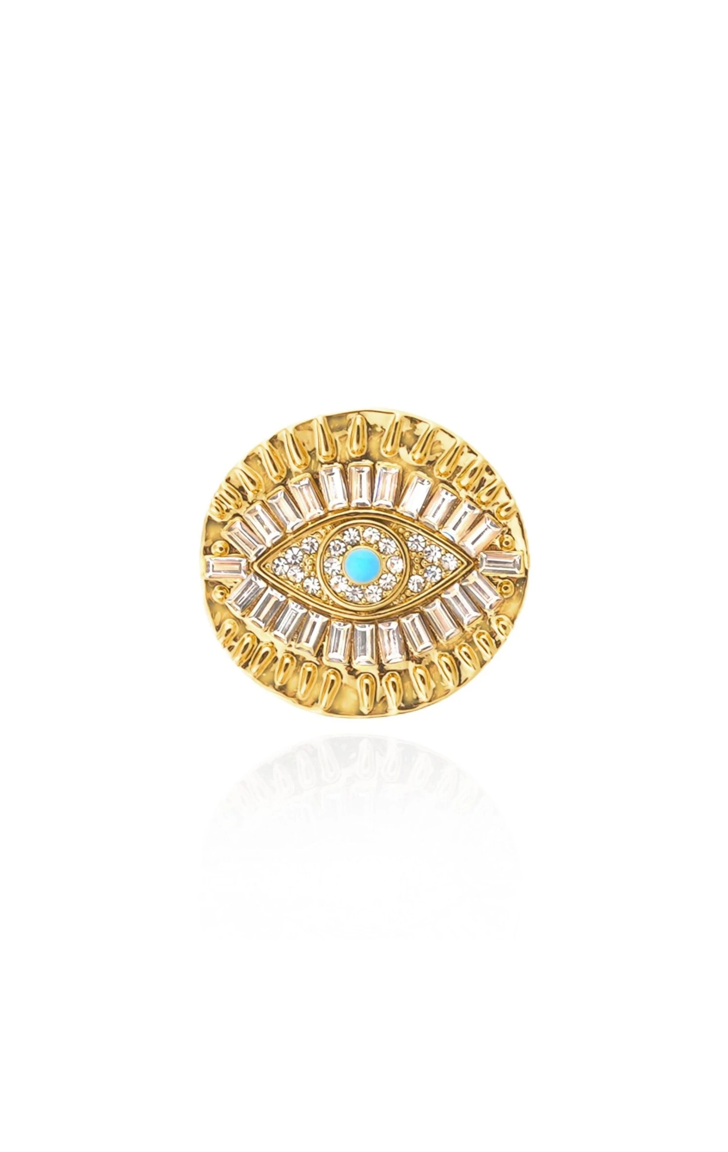 Au cœur de notre thème Coral Coast, où la mer dévoile aussi ses vertus protectrices, nous avons intégré des éléments précieux imprégnés d’une bienveillance ésotérique, en harmonie avec l’essence même de notre marque. Doré à l’or fin, notre bague Ramsez est montée sur un corps de bague doré à l’or fin et ouverte au dos pour un confort optimal. Arborant notre emblématique œil protecteur dessiné d’un motif composé entièrement de strass facettés rectangulaires sur une médaille martelée, Ramsez est une pièce éblouissante!