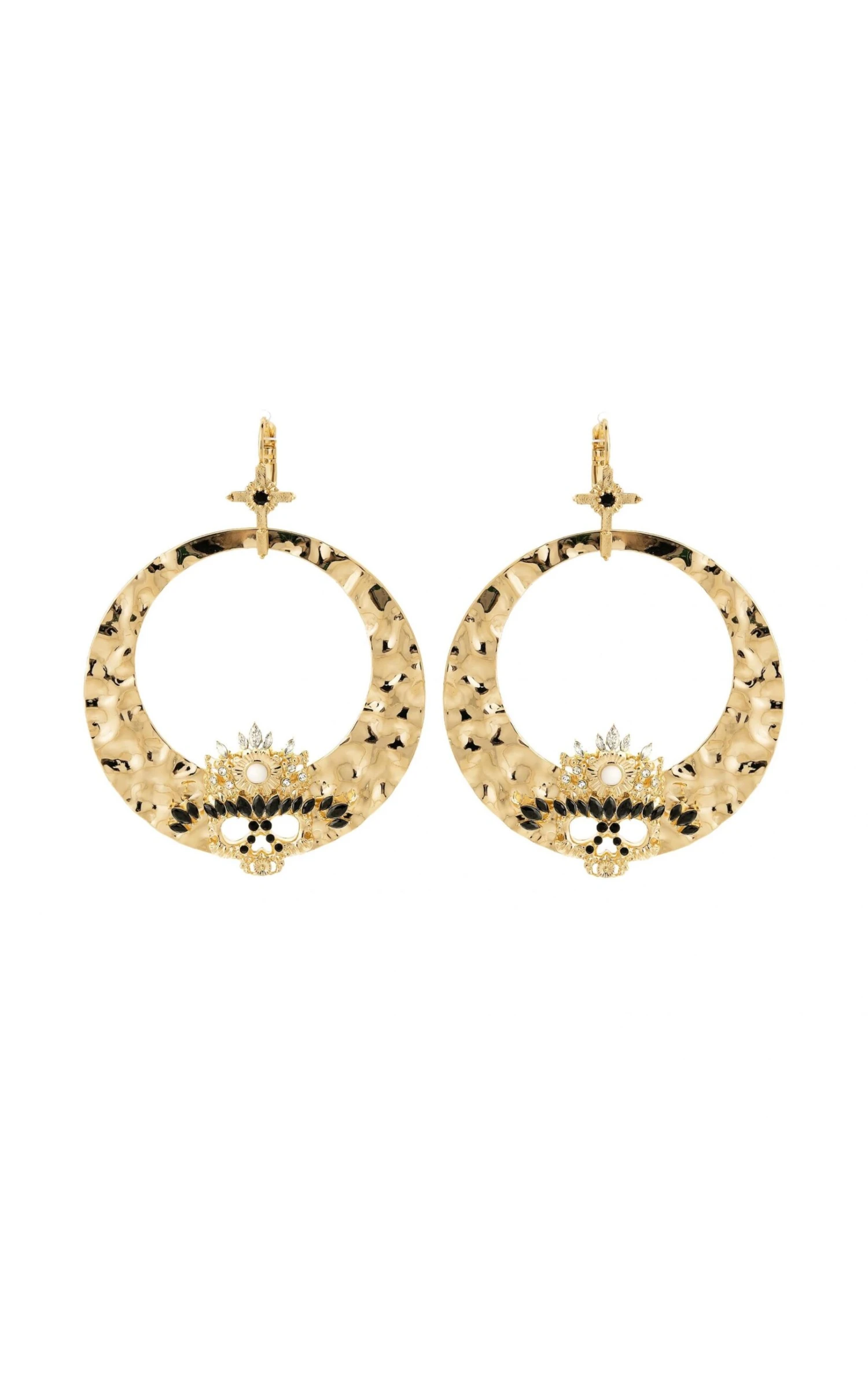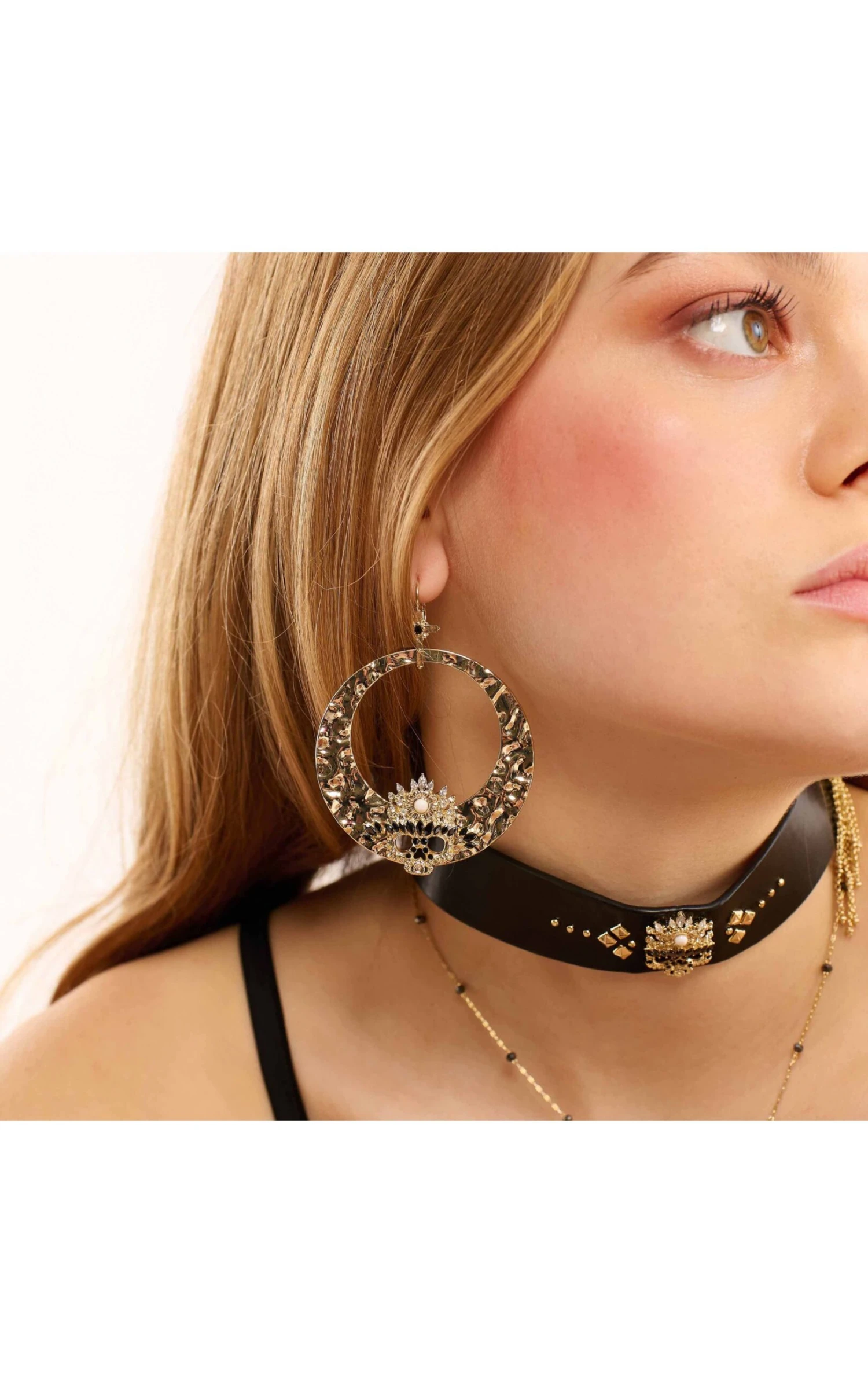 Le style gothique n’est plus aussi radical, il se laisse mixer et influencer avec subtilité. La preuve : nos sublimes boucles d’oreilles Jessie mélangent les symboles emblématiques gothiques avec une minutie d’orfèvre qui leur confèrent une allure à la fois précieuse et puissante. Les boucles d’oreille Jessie sont des créoles dorées à l’or fin divinement martelées, montées sur dormeuses et fixées sur une magnifique croix ornée d’un cabochon noir onyx, encadré par de petits strass effet diamants. Sur la partie inférieure de la créole, trône une fascinante tête de mort au chic précieux et baroque, ornée de strass et de cabochons noirs, blancs et cristallins, qui subjugue et hypnotise.
