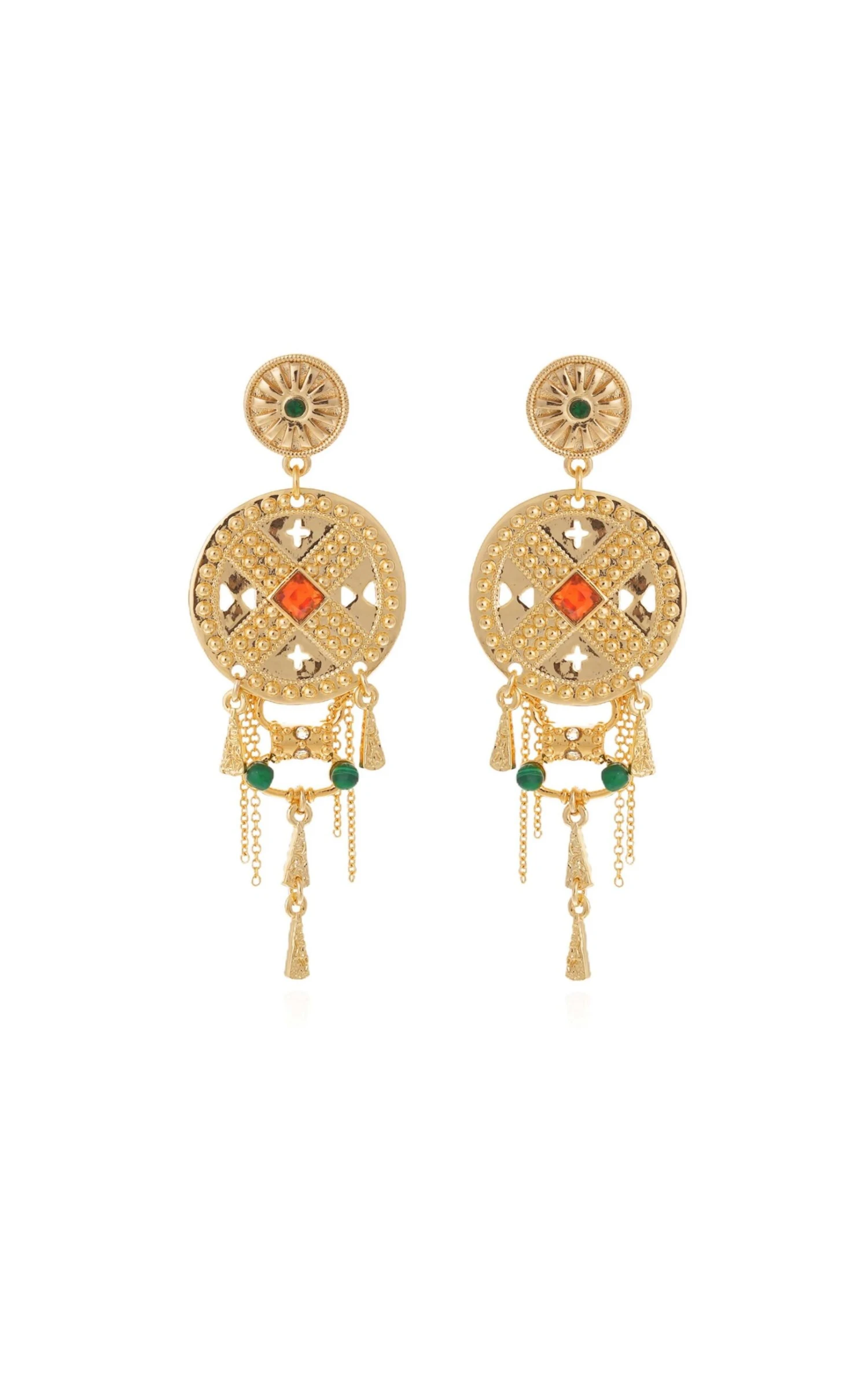 Véritable hommage à la splendeur et à la richesse de la civilisation Maya, les boucles d’oreille Paramor se composent d’une première pièce ronde dorée à l’or fin, ornée de lignes rayonnant autour d’un cabochon vert malachite de laquelle se balance une seconde pièce ronde plus cossue dont la symétrie des lignes et la minutie du martelage rappellent l’esthétique riche et somptueuse de la civilisation Maya. La forme en losange du cabochon central vient équilibrer la rondeur des pièces et apporter une élégante sophistication à l’ensemble. D’adorables pampilles viennent parfaire cette boucle d’oreille iconique, à l’allure folle qu’on arborera fièrement à la première occasion !