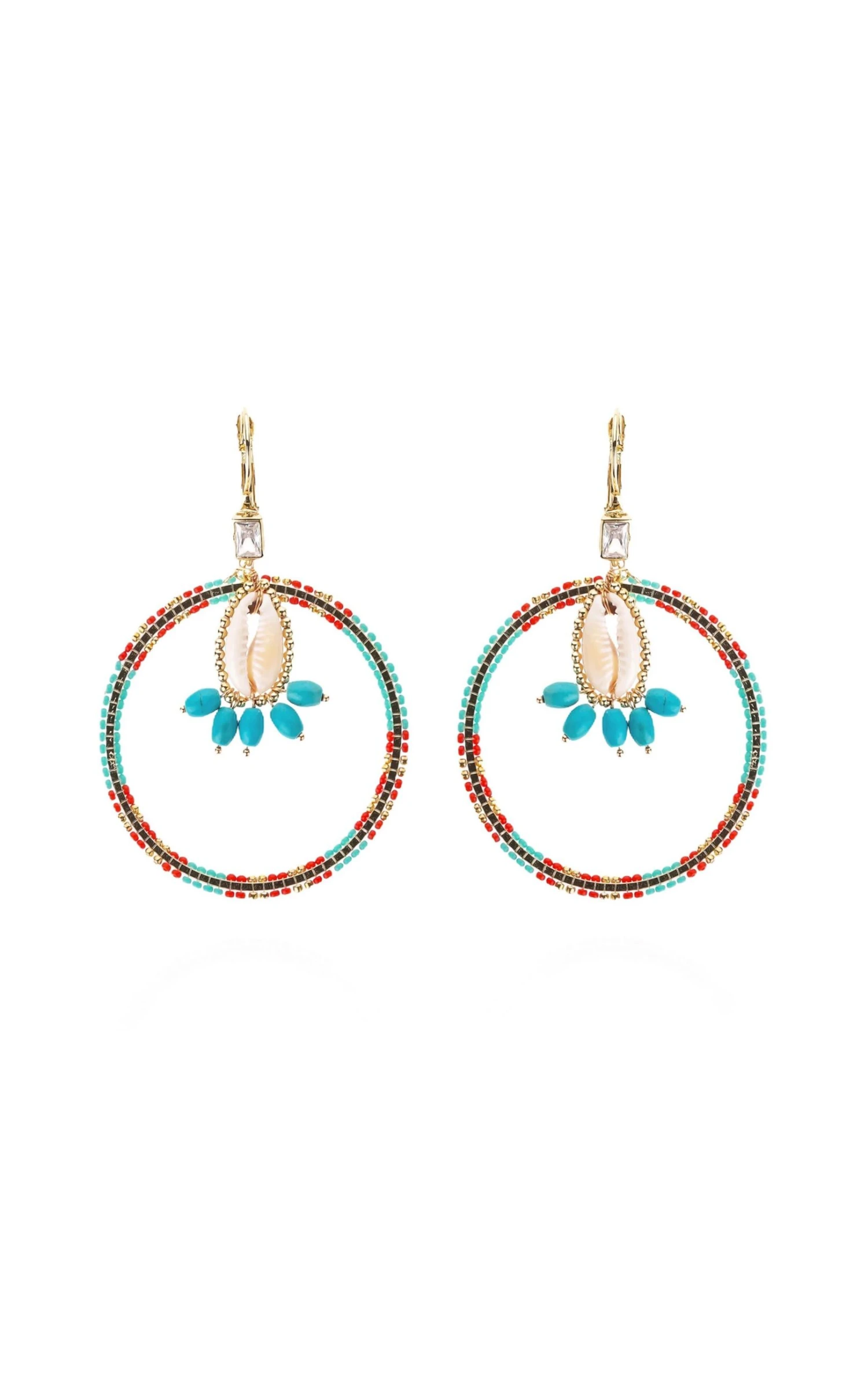 Récif est une créole dorée à l’or fin qui marie les éléments avec panache : un cabochon serti monté sur un cori cerclé de petites boules dorées constitue la partie haute de la boucle tandis qu’un double anneau perlé de corail et de turquoise vient compléter et parfaire cette boucle montée sur dormeuses.