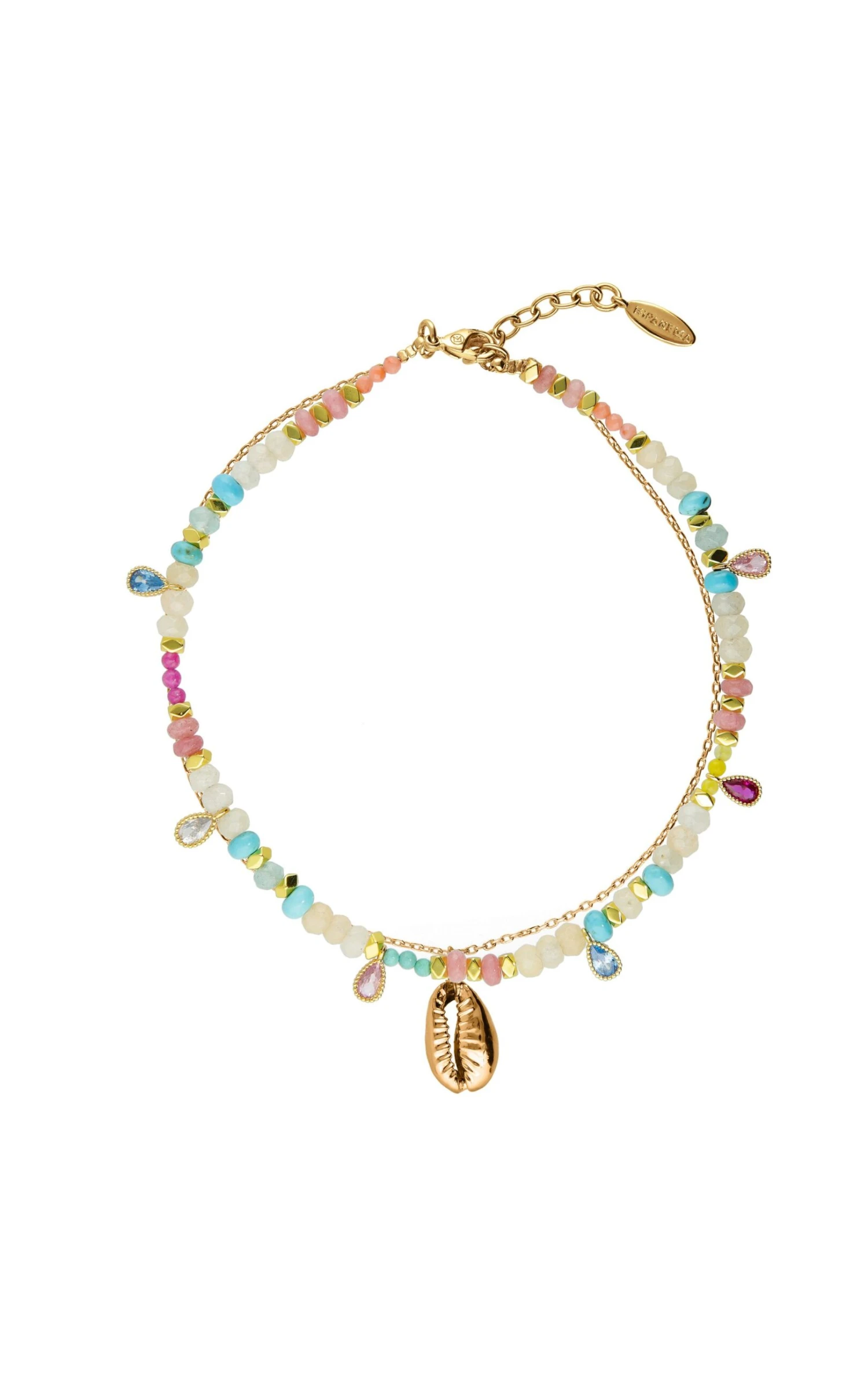 Chaîne de cheville dorée à l’or fin 14 carats composée de deux liens : le premier est décoré de perles semi-précieuses aux couleurs pastels, beige, turquoise, corail et rose. Le deuxième se compose d’une chaîne ornée d’un coquillage cauri doré. Une pièce idéale pour un look estival très gypsy !