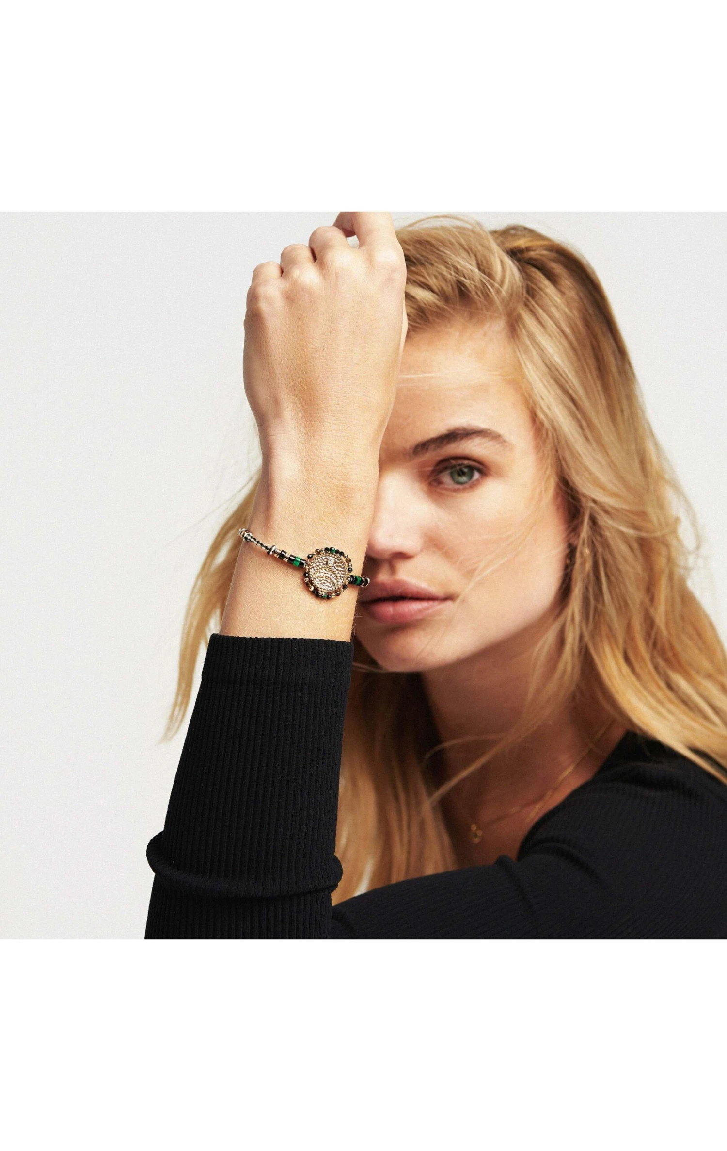 Vous aussi craquez pour ce petit bijou au caractère précieux et coloré à la fois! Vous allez adorer ce petit bracelet doré à l’or fin 14 carats, monté sur une tresse bicolore noir et blanc. Il est composé de pierres semi-précieuses en rondelles dans les tons noir onyx, vert malachite et sequins dorés à l’or fin 14 carats disposées de part et d’autre d’une pampille centrale. Celle-ci est dorée à l’or fin et entièrement décorée de petites billes, inspirées de l’époque italienne des étrusques. La pampille centrale est encerclée de perles semi-précieuses dans les tons vert malachite, noir onyx et quartz fumé.
