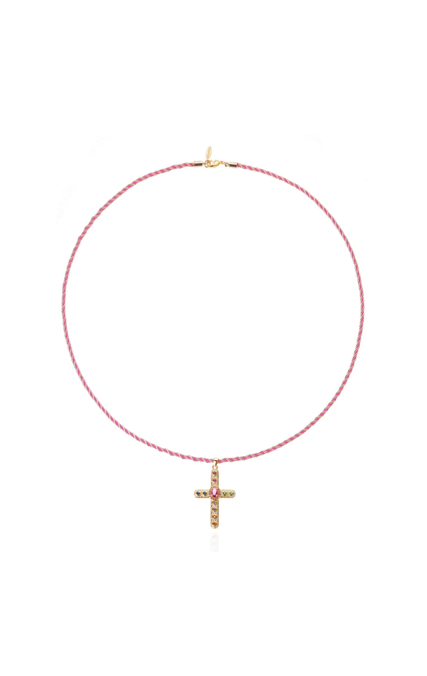 Superstition divine, ésotérisme bohème, explosion effervescente de couleurs et volumes fantasques: bienvenues dans notre thème Brazil interprété avec éclat par notre collier Boniface! Long sautoir aux allures de collier chapelet revisité, le collier Boniface est monté sur une magnifique chaîne torsadée dorée et rouge vif de laquelle se balance avec faste une belle croix en émail blanc cassé décorée de strass multicolores et ornée en son centre d’un cabochon aux reflets grenat cerclé d’une rangée d’adorables petits strass de la même couleur. Une pièce mémorable qui électrisera toutes nos silhouettes estivales. Se décline en quatre couleurs.