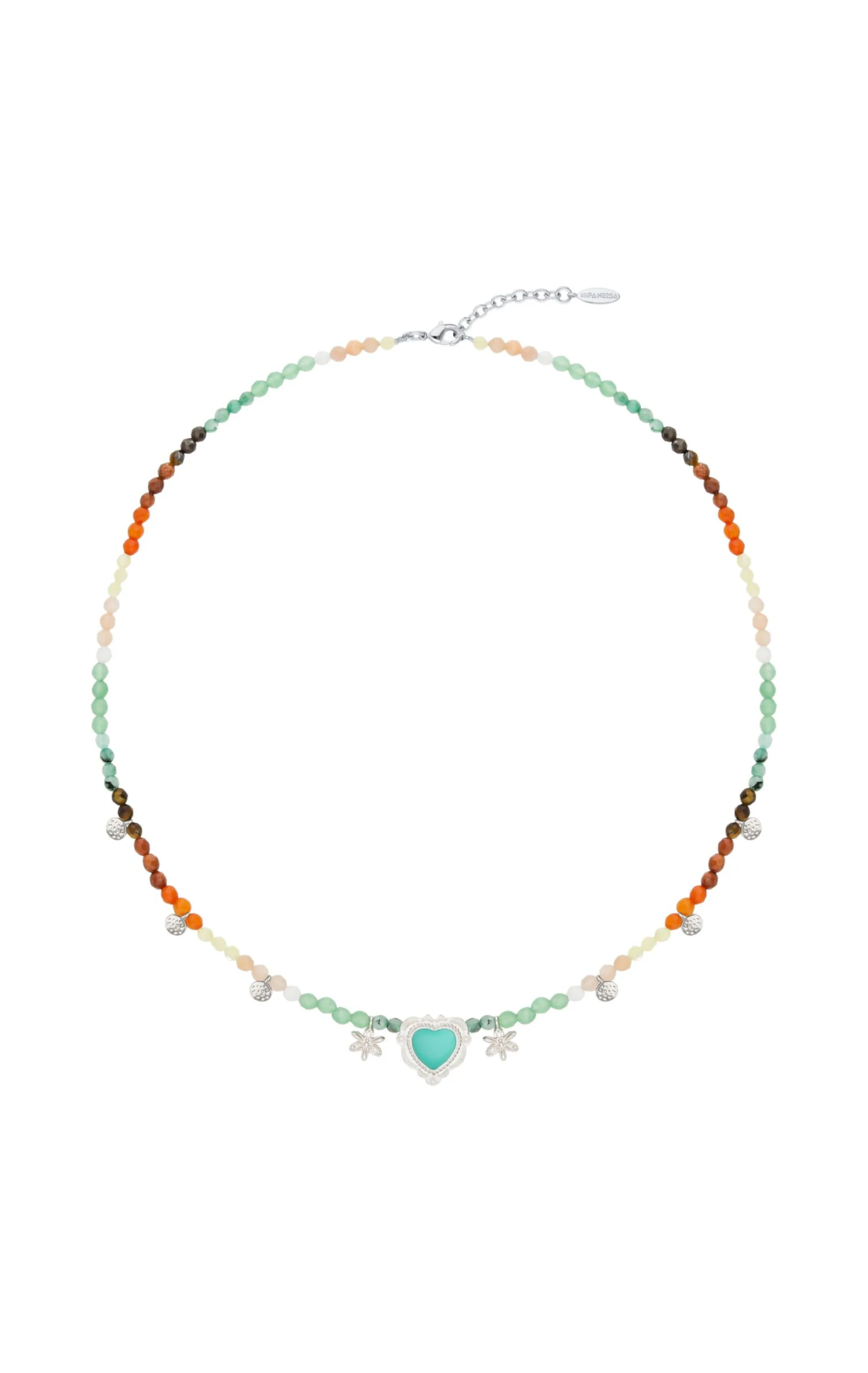 Collier en pierres semi-précieuses – tourmaline rose, quartz teinté, hématite, turquoise – sur un montage en laiton argenté, rehaussé de petites pampilles argentées. On aime le mélange Amérique Latine des pierres colorées, dans une déclinaison de tonalités Terre, ocre, avec ce cabochon central en forme de cœur ex-voto travaillé d’inspiration Nouveau-Mexique, orné d’une résine turquoise. Il est entouré de deux petites pâquerettes strassées effet diamant. Une ravissante pièce facile, pile dans l’ADN Hipanema, à porter seule ou en accumulation. Ce bijou est fait à la main.