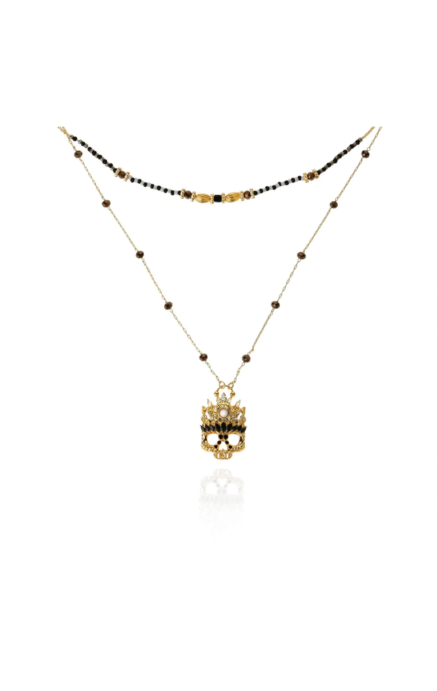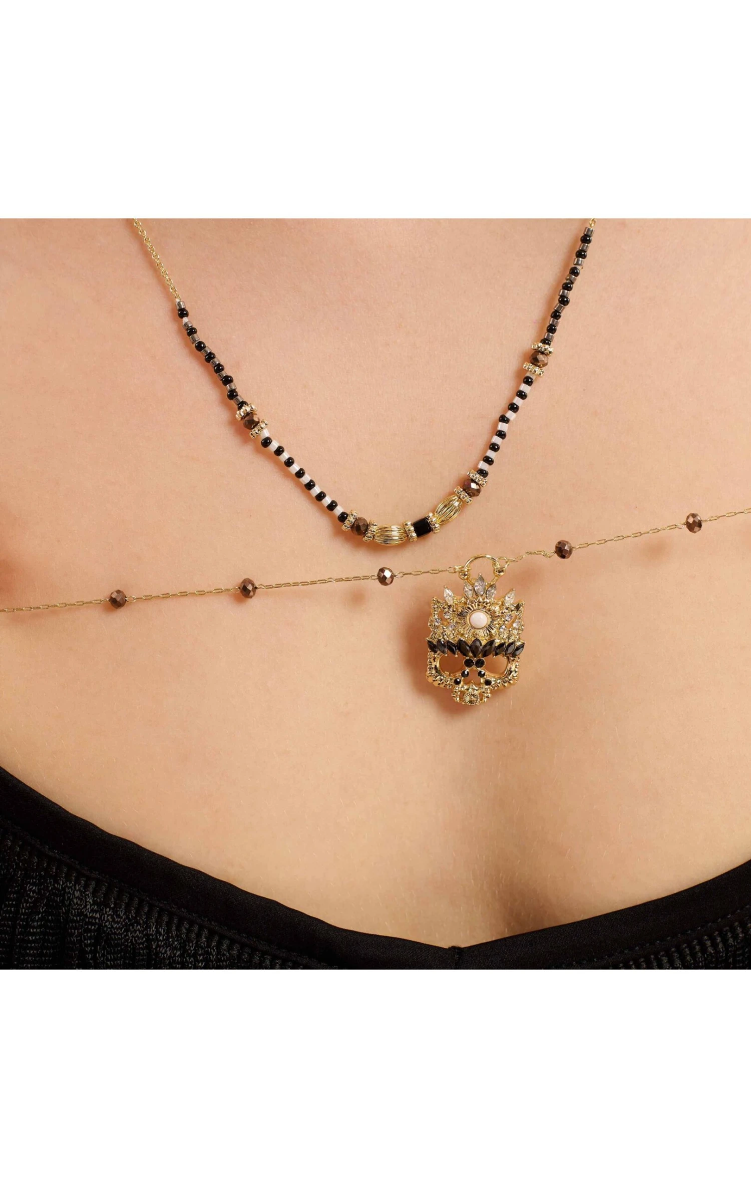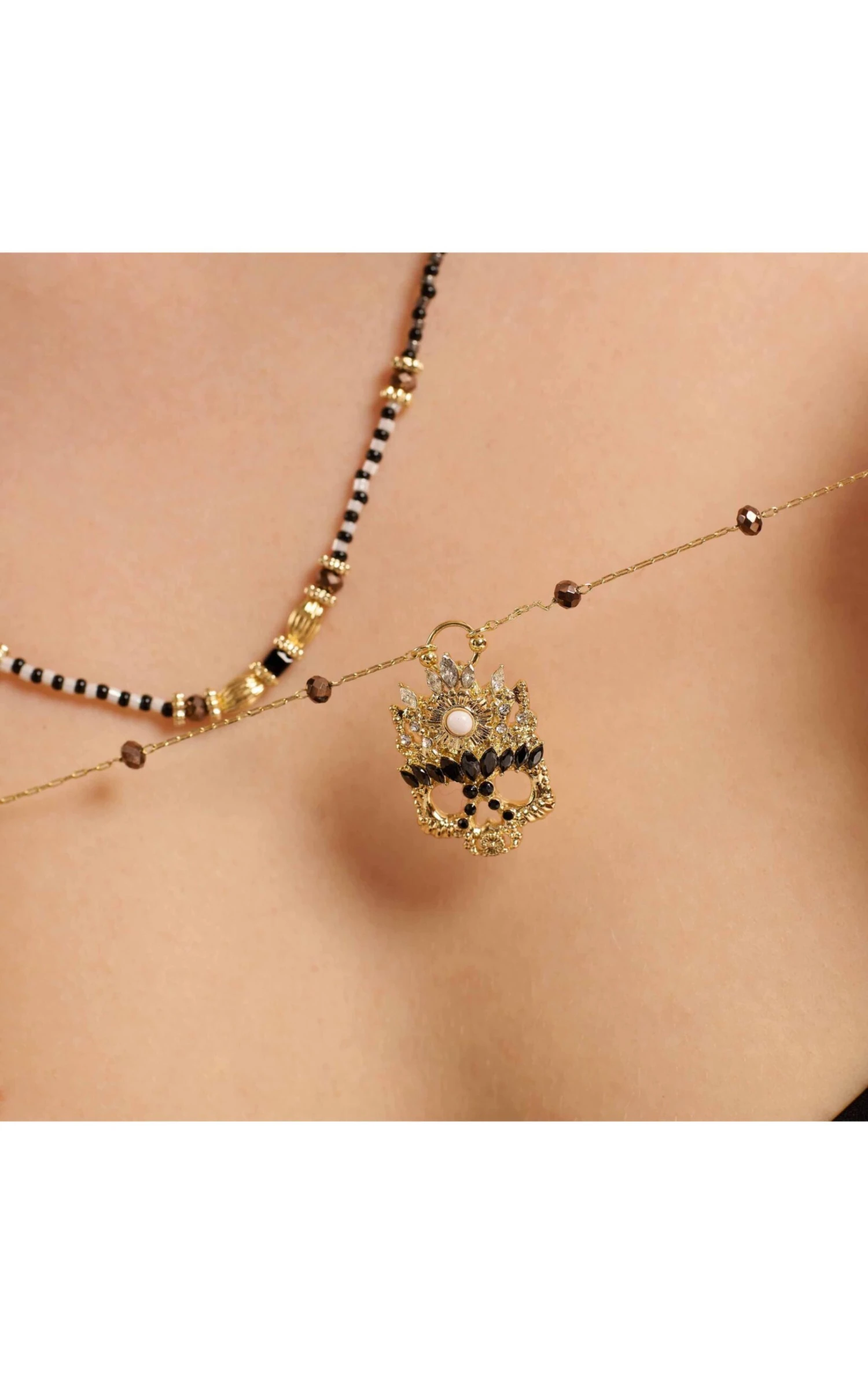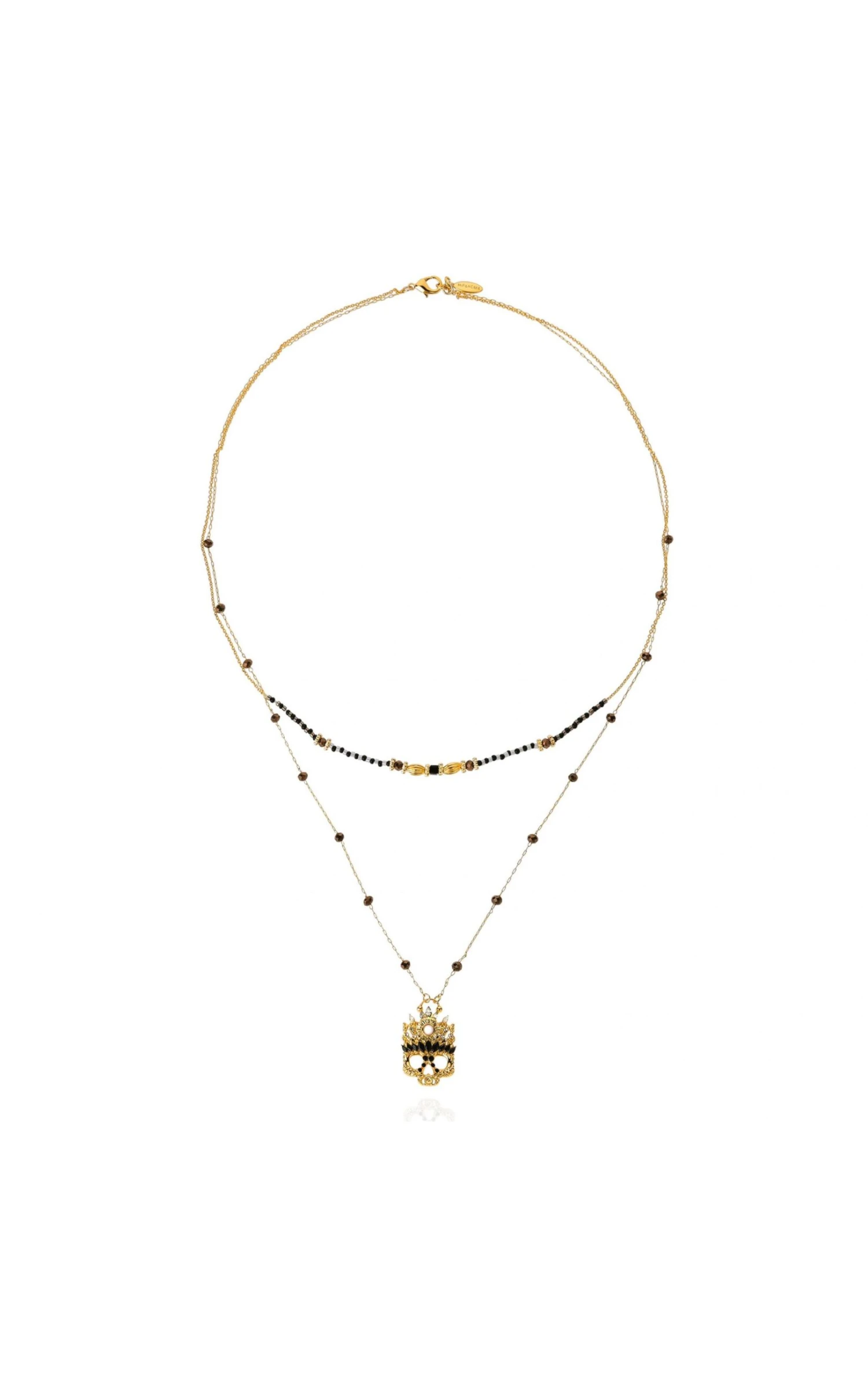 Doré à l’or fin, il arbore un premier lien assez long, en chaîne chapelet rythmée par des perles facettées gris hématite parée de notre précieuse tête de mort réinterprétée en masque strassé de cristaux noirs et ornée d’un cabochon blanc nacré.