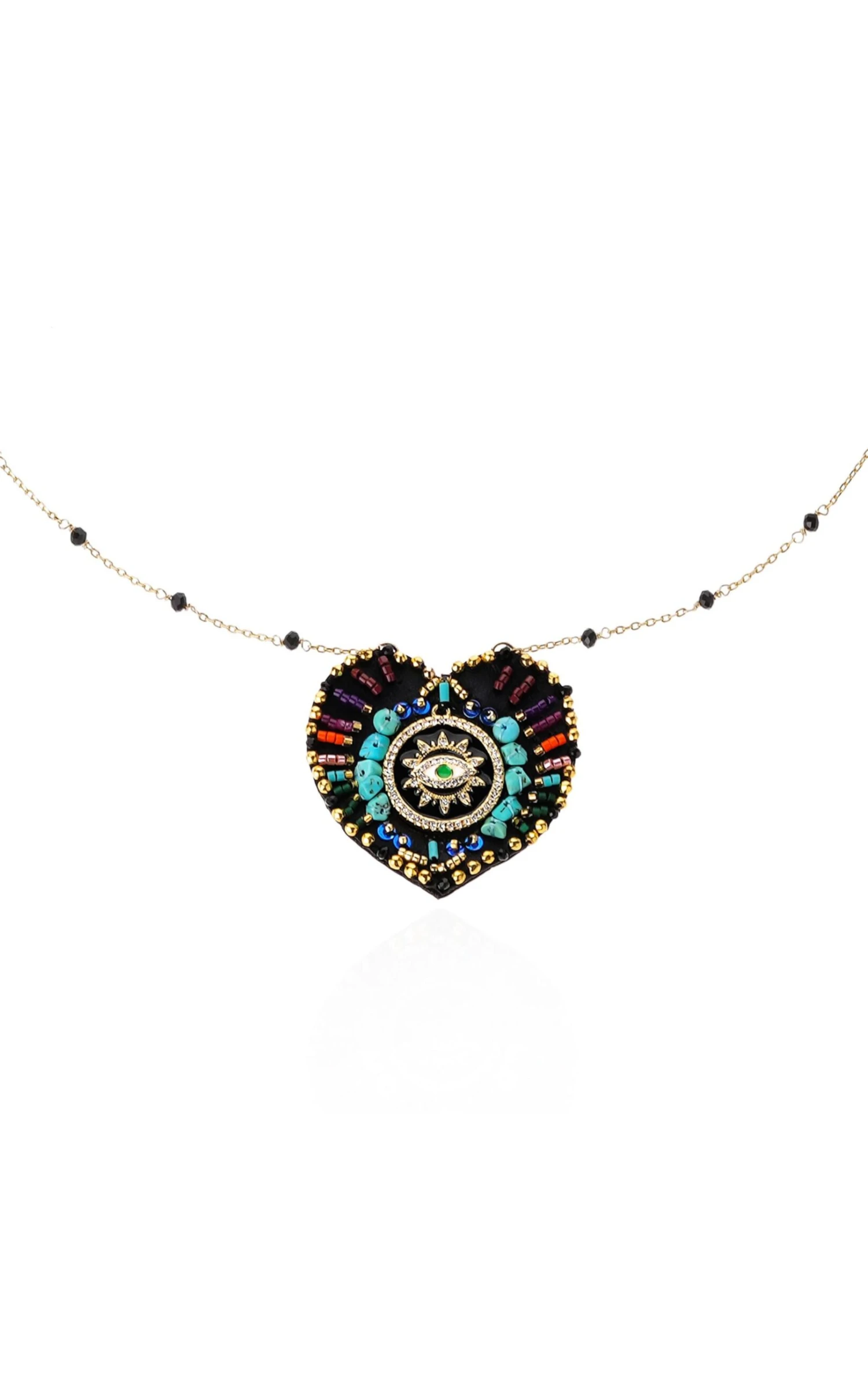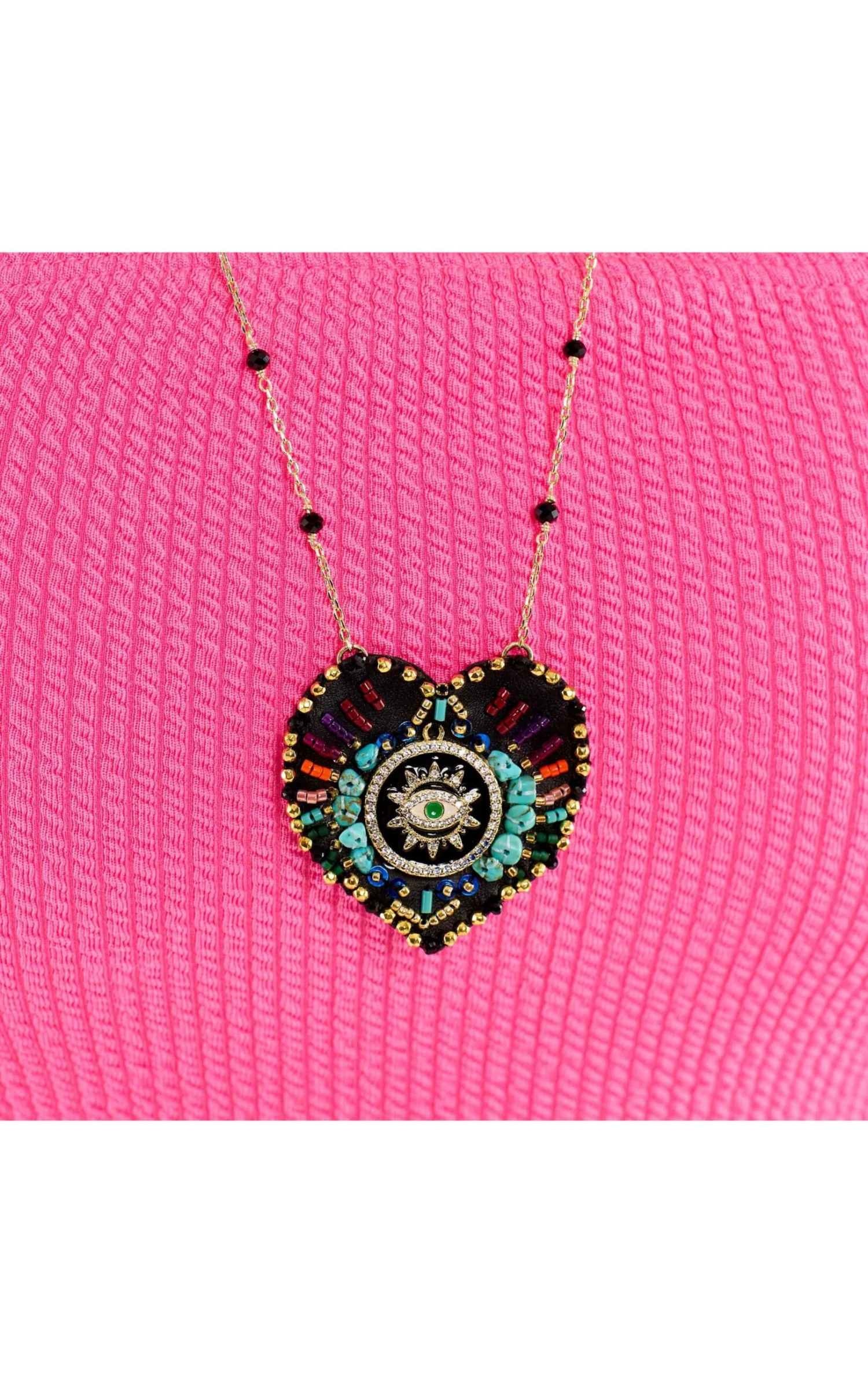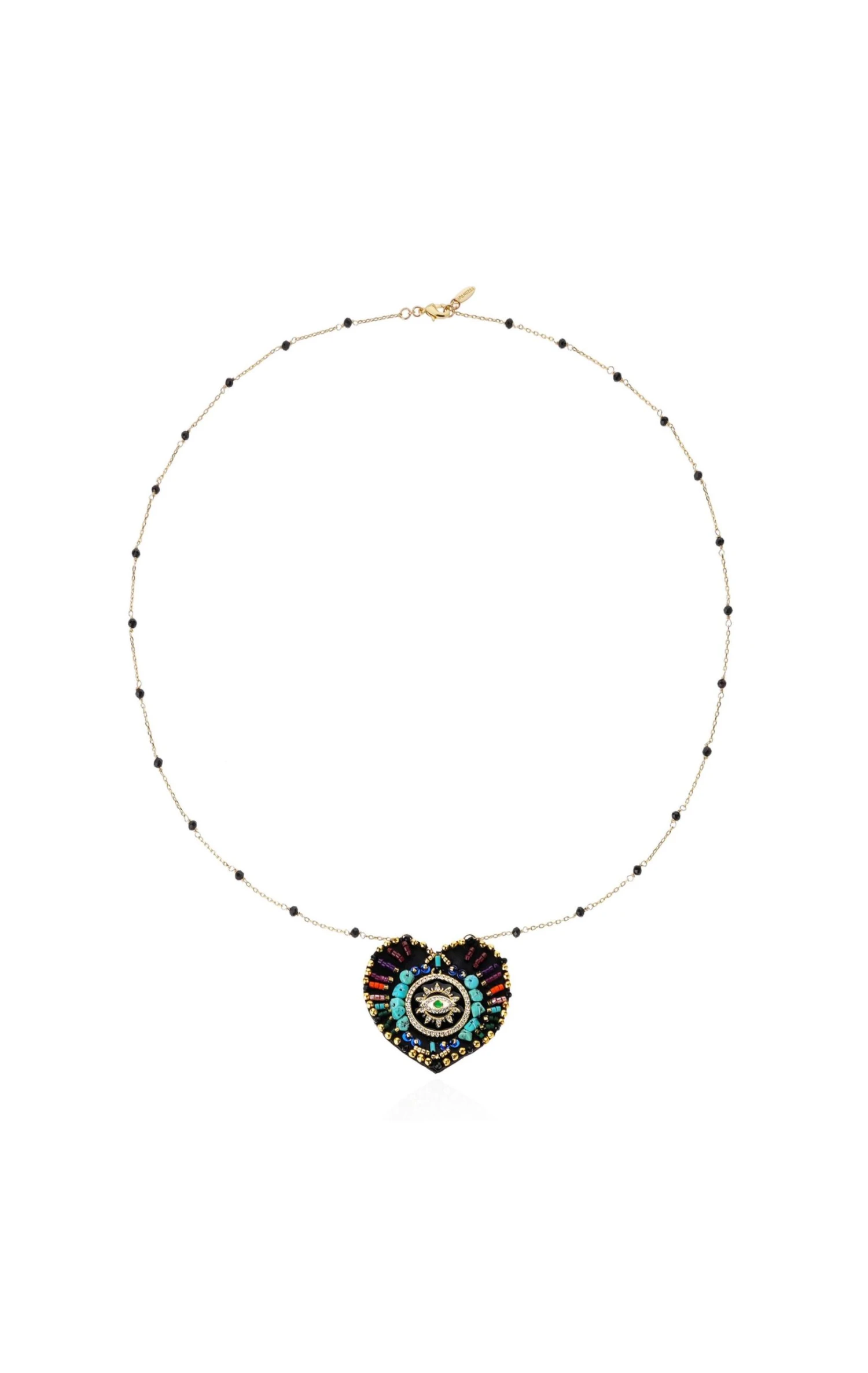 Notre thème Brazil évoque le sacré à travers la splendeur flamboyante du Brésil et son aura solaire. Les formes sont audacieuses, les strass illuminent les créations de leur éclat, et les symboles ésotériques se transforment en nuances vibrantes. Le collier Janeira, monté sur une chaîne chapelet ornée de perles facettées noires, présente un pendentif en cuir noir évoquant un ex-voto en forme de cœur, délicatement brodé à la main de motifs perlés multicolores. Icône lumineuse, cette pièce d’exception promet un été étincelant!