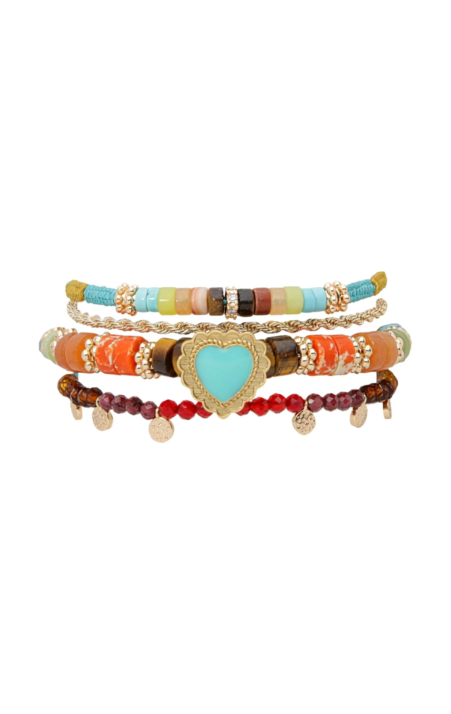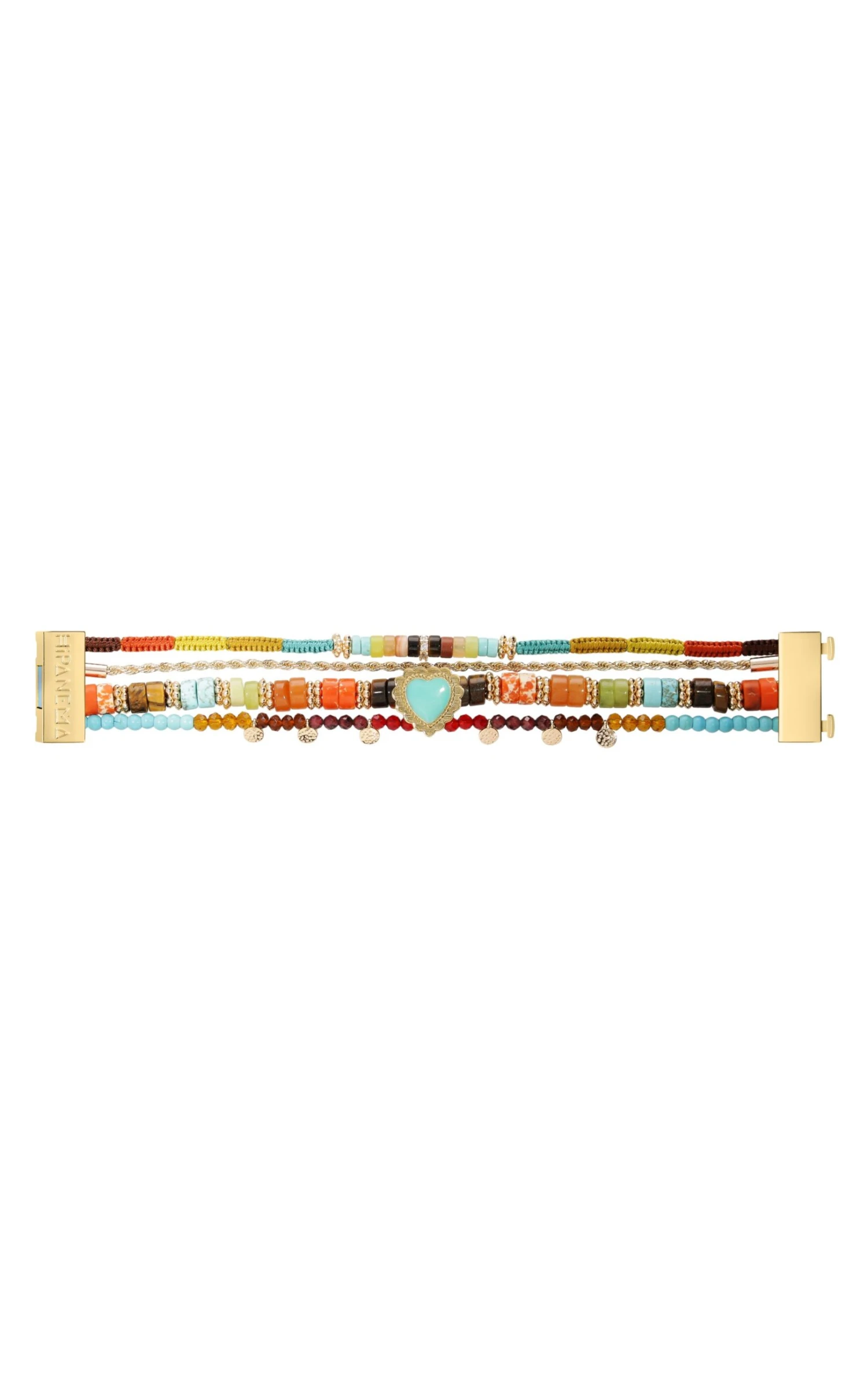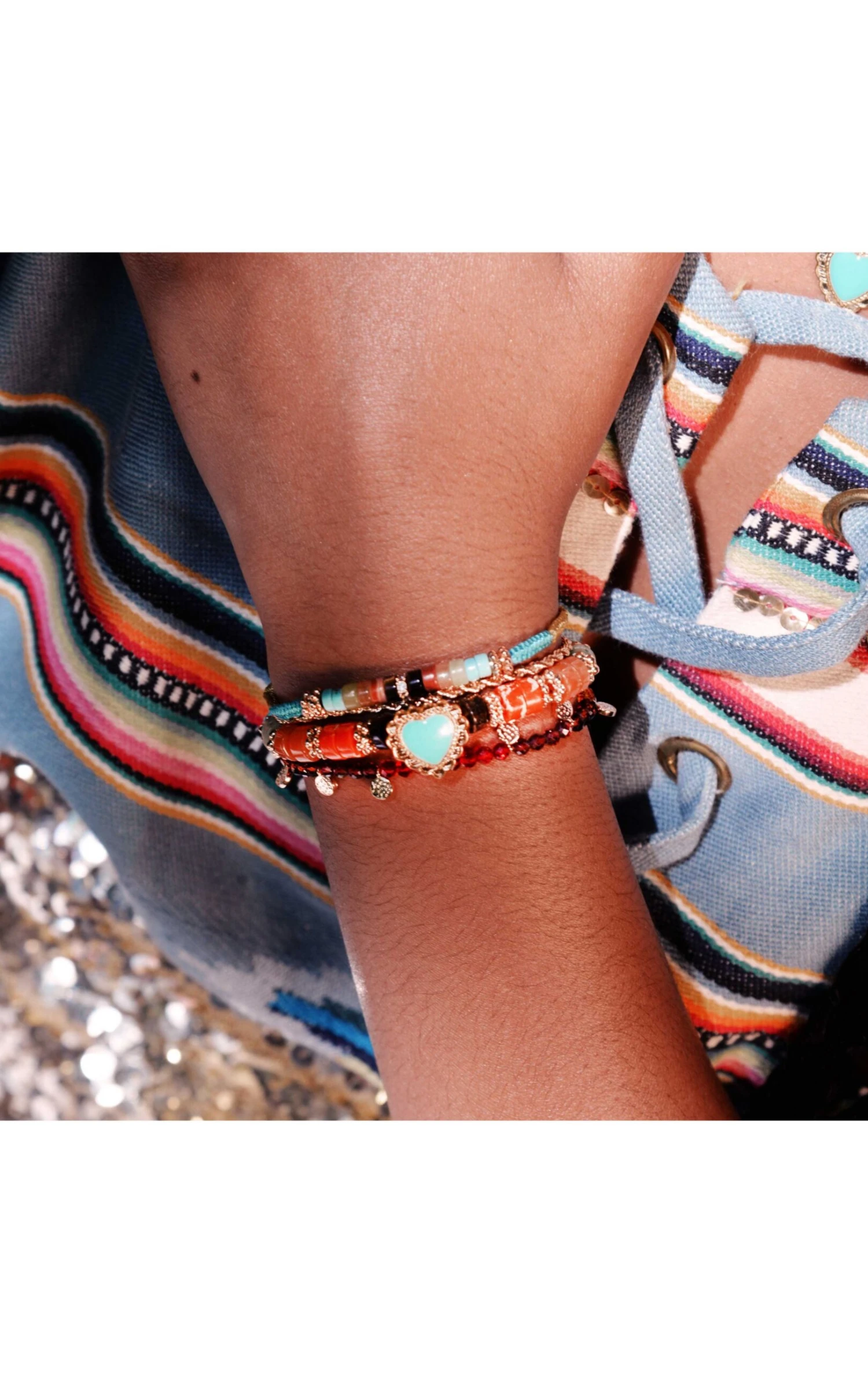 Avec Hipanema et nos manchettes vibrantes de couleurs, c’est l’été toute l’année. Des bracelets bonne-humeur entièrement faits à la main, que nous réinventons chaque saison, dans la joie et les couleurs! Ce bracelet manchette multi-liens réinterprète la thématique forte de notre collection Nouveau-Mexique avec son cabochon cœur ex-voto en son centre, orné d’émail vert turquoise. Il est sur un lien en rondelles de pierres fines – œil de tigre, jade, turquoise, quartz teinté, grenat -, avec un lien de petites perles facettées, dans un dégradé de couleurs Navajo, ce côté Terre de Sienne, ocre. On retrouve une chaîne enroulée, ainsi qu’un lien tissé avec du coton pour l’esprit porte-bonheur, orné de petites perles rondelles en son centre. Aussi ethnique chic que pratique avec son fermoir aimanté, gravé Hipanema, très facile à mettre et à enlever.